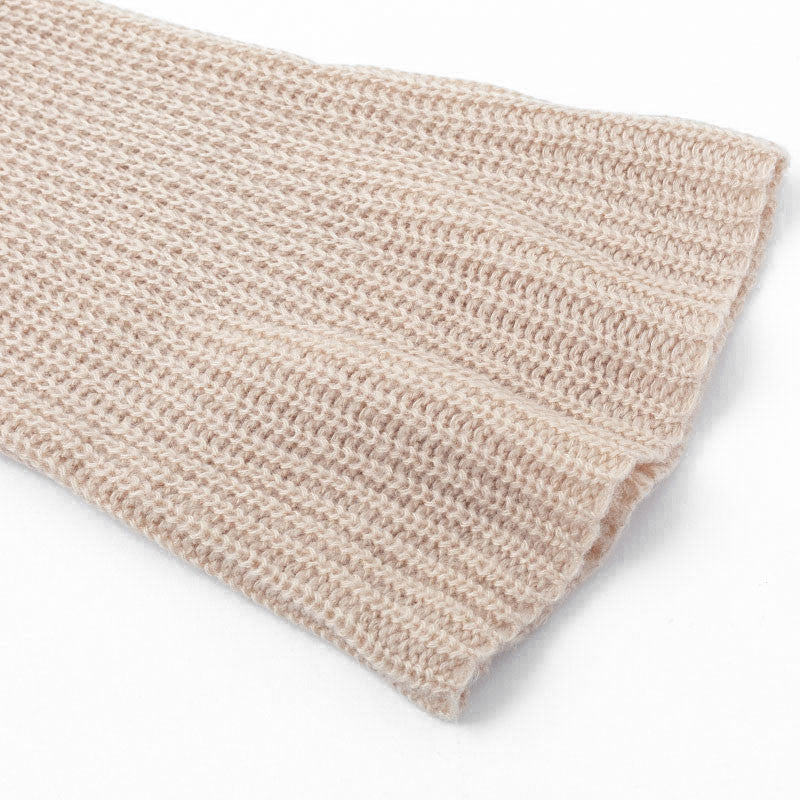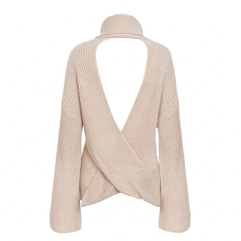 We like this unique look. This neutral colored, knitted sweater can be worn over a tank top or bandeau-top of your choice for a little sexy-back surprise when you turn around.
